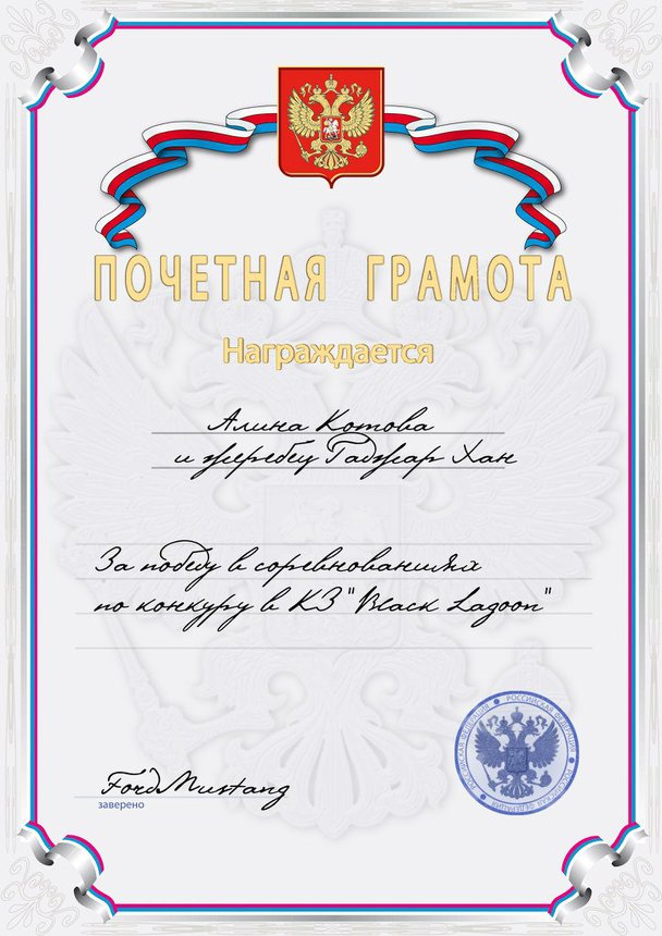 Второй спортивный разряд по конному спорту, конкур (2011 г). Неоднократный победитель и призер соревнований по конному спорту (2010-2015 г). Член Национальной Федерации с 2006 года. Опыт более 8 лет